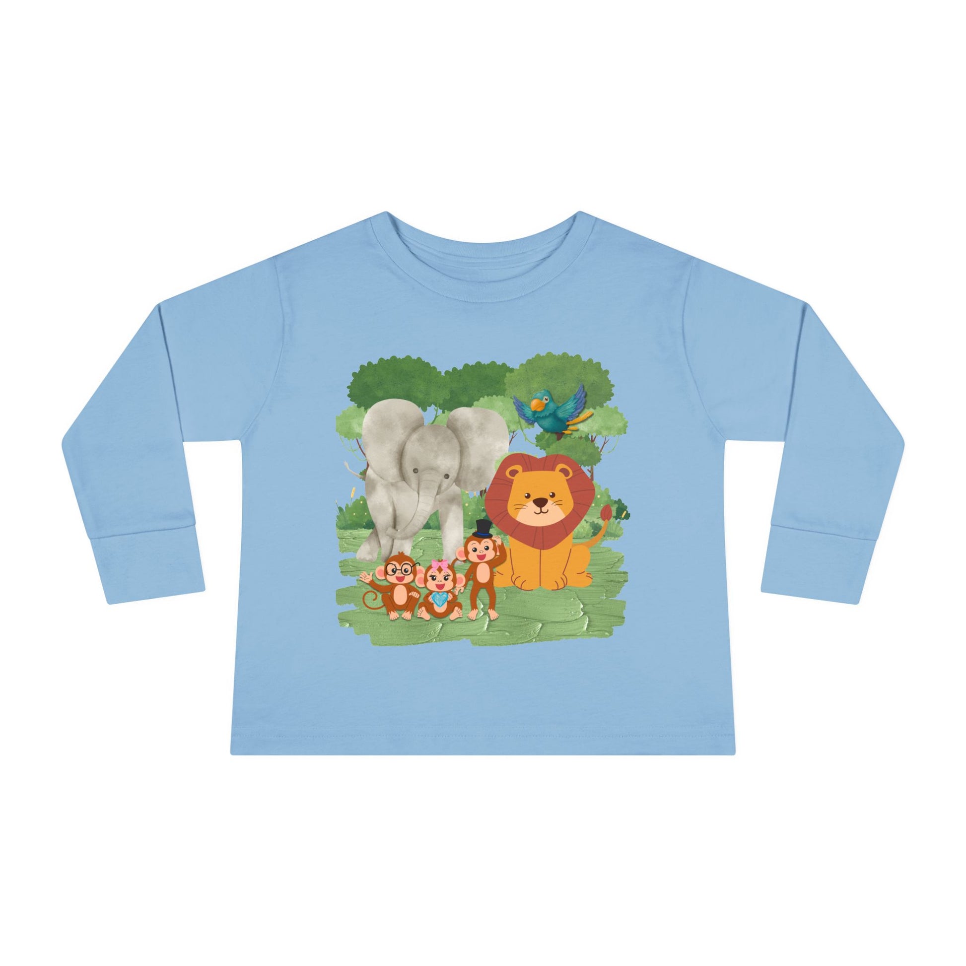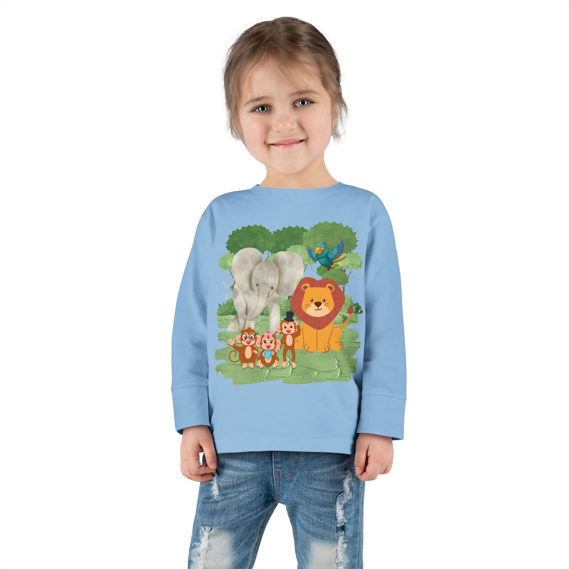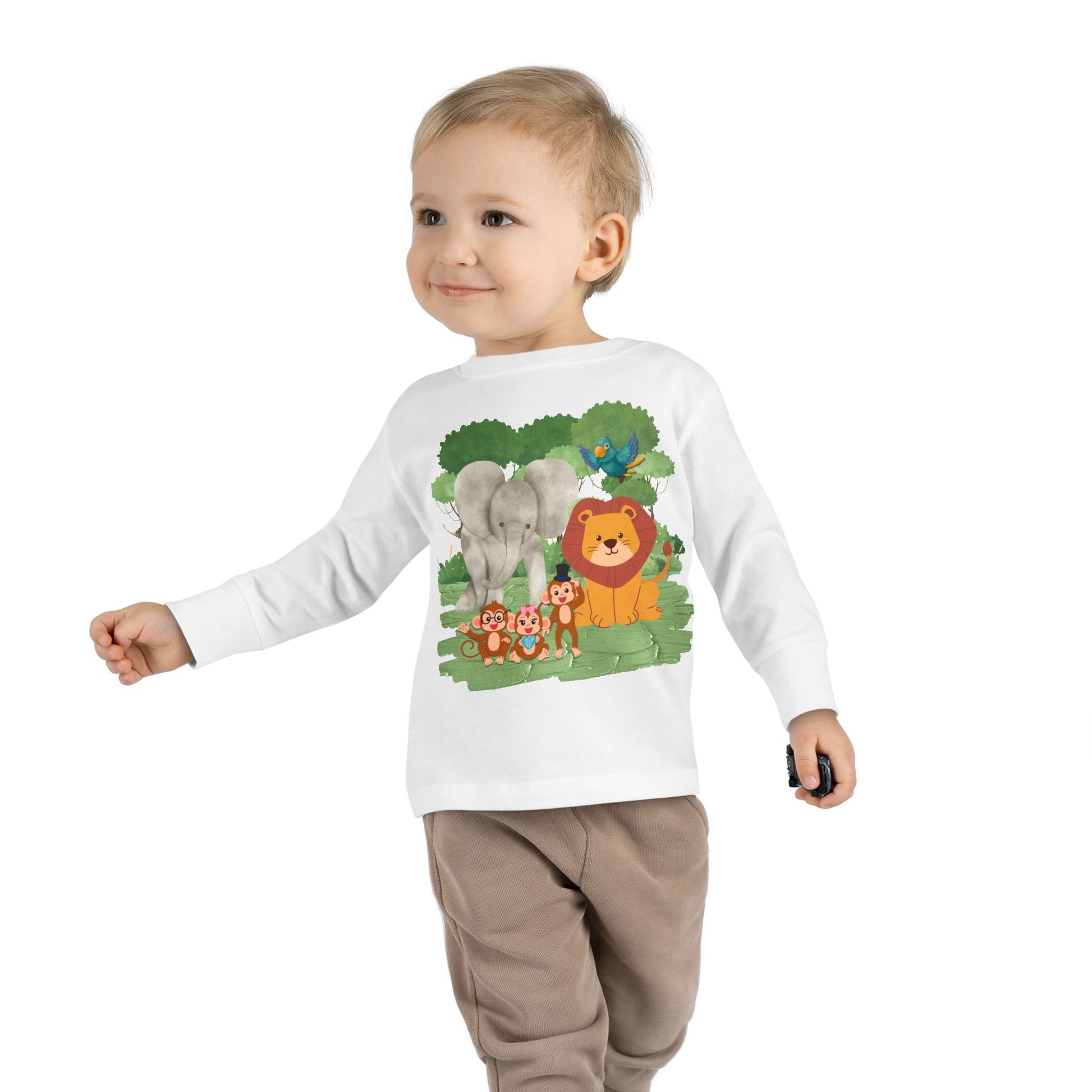 Soft, playful, and gentle — this toddler long sleeve tee brings a tiny safari adventure to little ones. A friendly lion, curious elephant, chirping bird, and three cheeky monkeys gather among painted jungle greenery, creating a comforting scene that invites imagination and afternoon storytelling. The light fabric and thoughtful construction keep wriggles comfortable while the ribbed cuffs and collar hold their shape through repeated washes. Dress them for a playdate, a nature-themed birthday, or a cozy morning of picture books — this tee fits into everyday routines with warmth and charm.